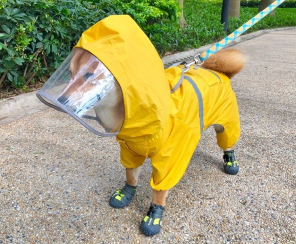 강아지용 레인코트는 강아지가 젖기 가장 싫어하는 부위가 얼굴이기 때문에 후드가 있는 제품을 사용하는 것이 좋겠습니다.