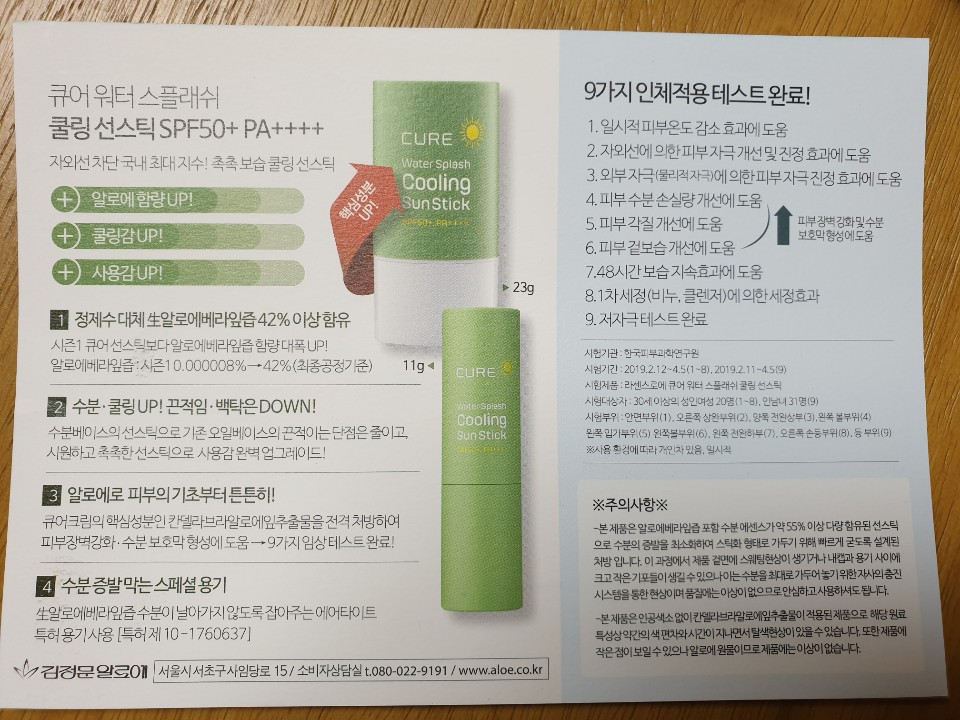 김정문알로에의 모든 제품에는 생알로에 성분이 함유돼 있어 알로에의 수분 보습막이 자극받은 피부를 진정시켜 주는 역할을 한다. 큐어 쿨링 선스틱도 바를 때마다 알로에 수분을 머금은 폴리머가 터지며 피부에 수분감을 전달하는 독특하고 시원한 사용감이 인기 요인이라고 합니다.