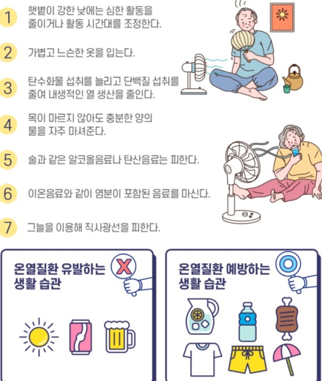연세가 많은 노인이나 지병이 있는 경우 온열질환에 신체가 대응하는 능력이 약해져 있는데, 이러한 온열 질환은 간단한 생활 습관으로 예방할 수 있다.