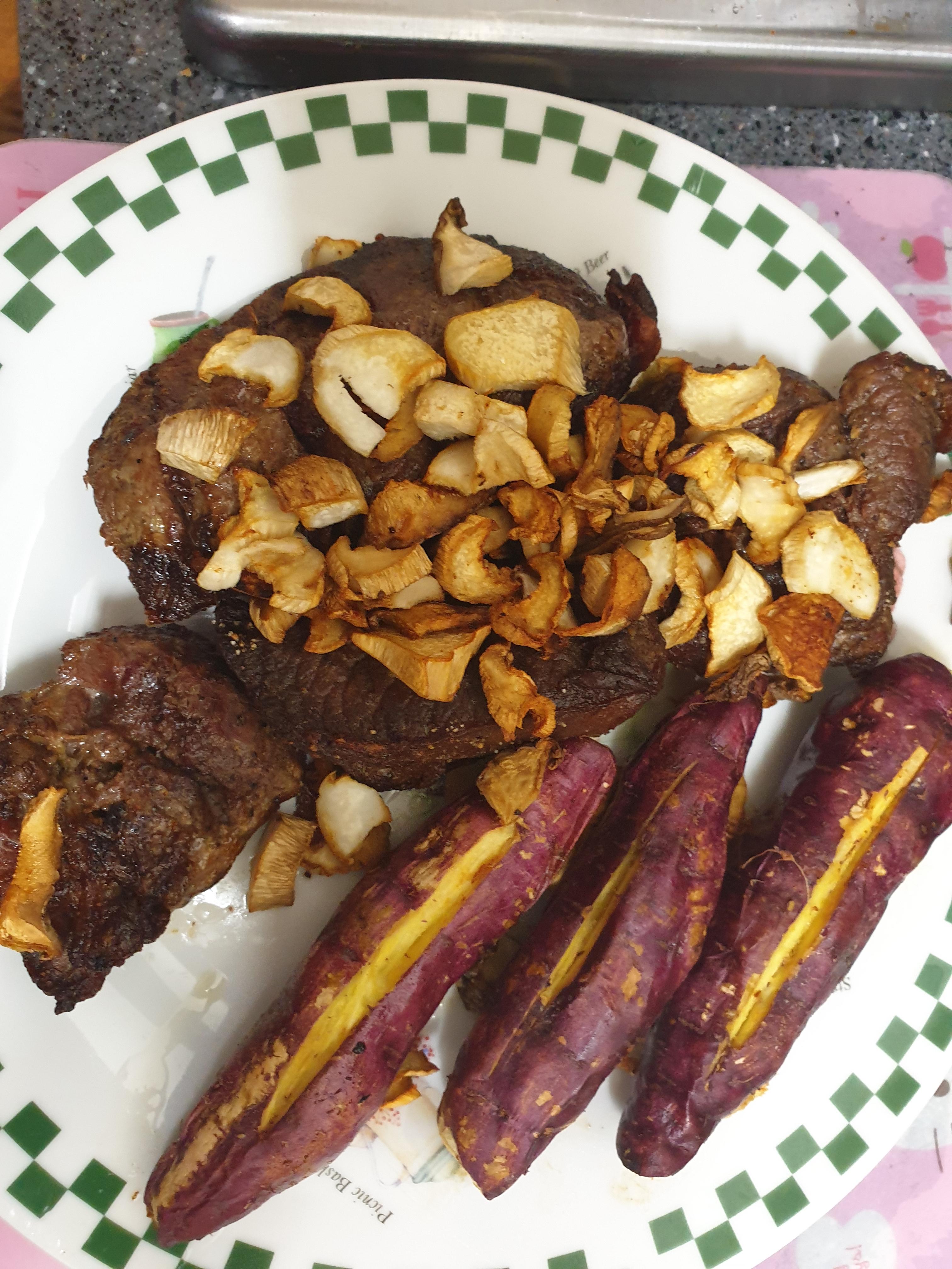 15분 후 고기를 뒤집어 주면서 위에 버섯을 올려주고 10분 더 돌려 주었어요.