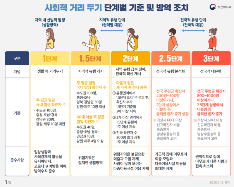 감염병이 장기화됨에 따라 더욱 효과적으로 '지속가능한 코로나19 대응'을 펼치기 위해 11월 7일 사회적 거리두기 단계가 3단계에서 5단계로 개편되었습니다.