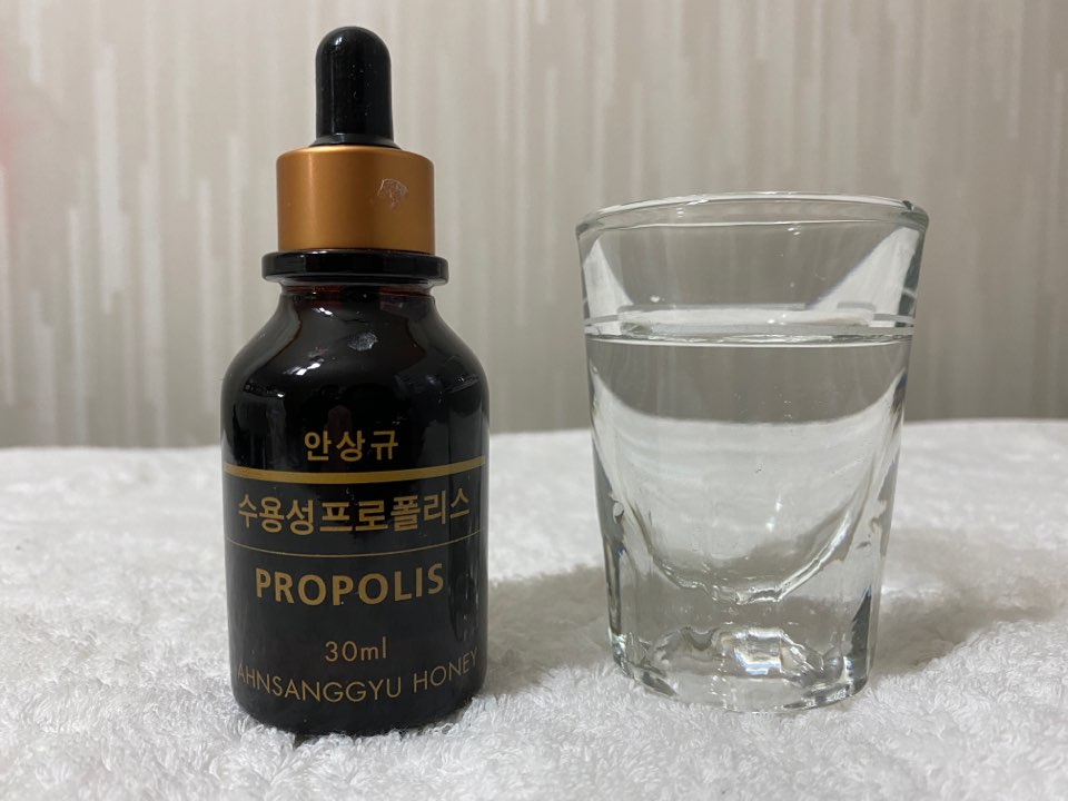 물에 떨어 트렸을때 뭉치지 않고 잘 퍼지는 프로폴리스가 좋은 프로폴리스 라고 하던데 잘 퍼지네요 ㅎ