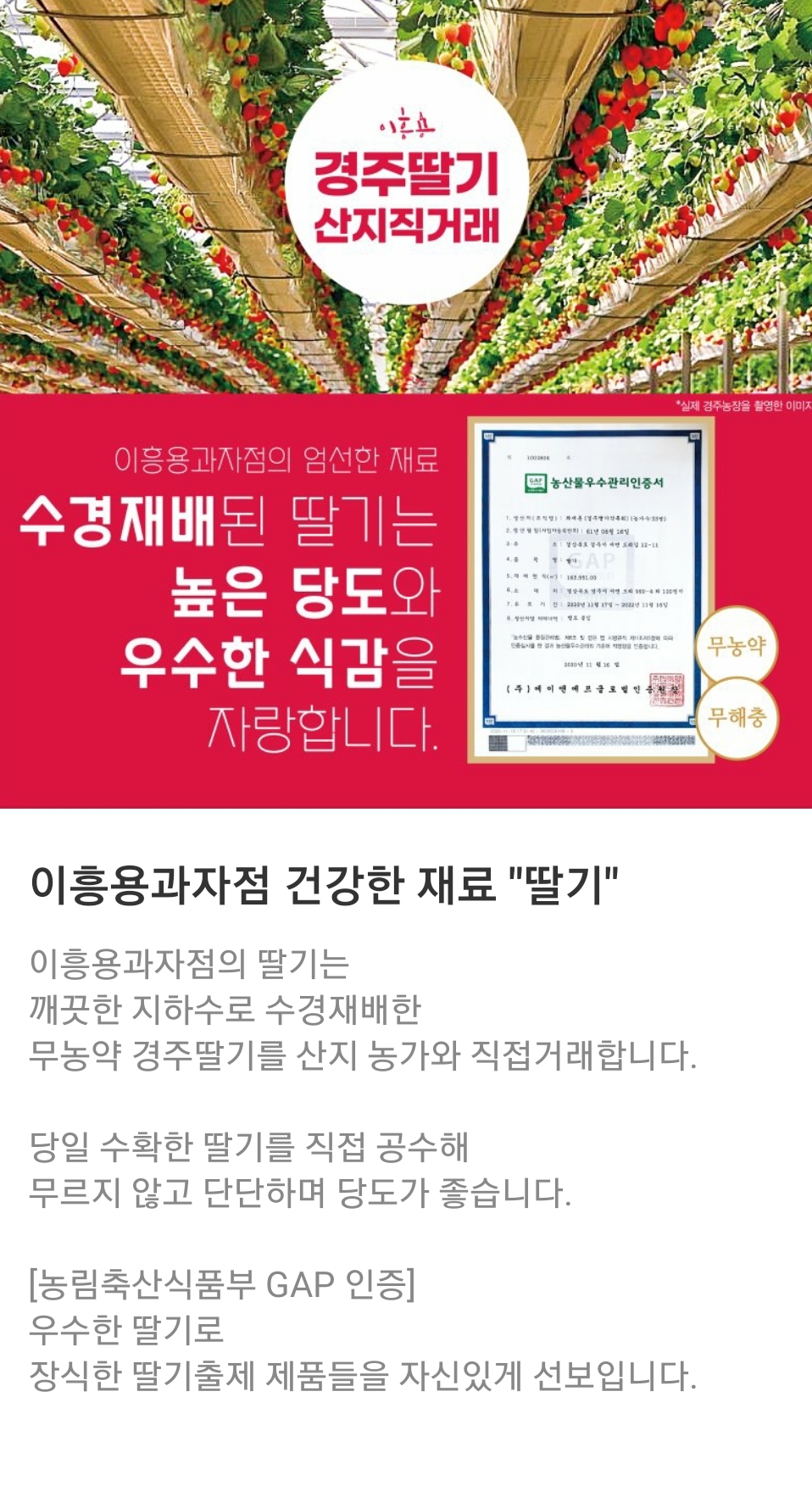 이흥용과자점 딸기는 경주 산지 직거래하는 딸기인데 지하수로 수경 재배한 딸기라고 한다.
