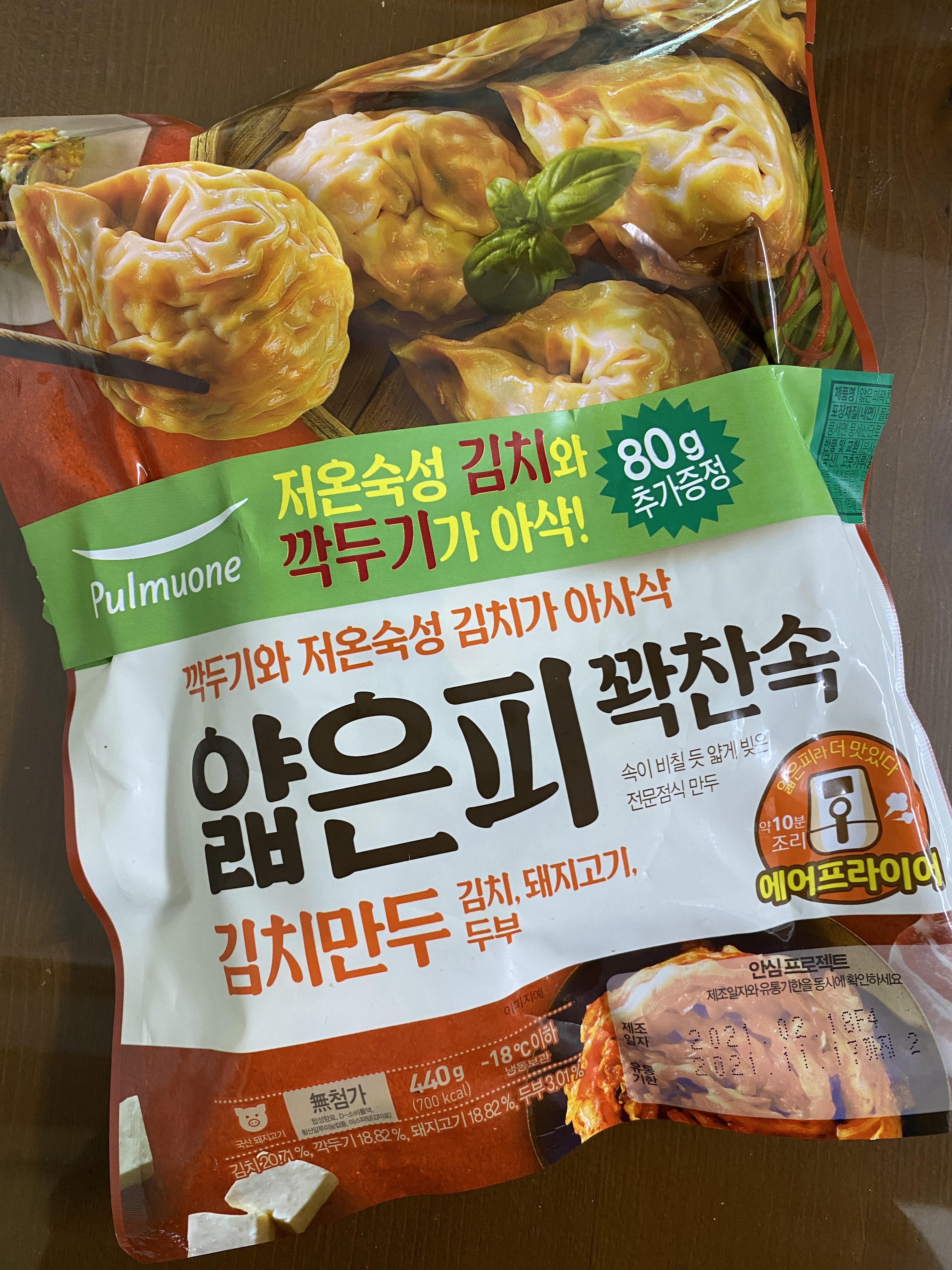 풀무원 얇은피 꽉찬 만두(김치맛)을 에어프라이어에서 꺼내면 약간 매콤한 냄새가 납니다. 꽤 매울 것 같은 느낌을 주지만... 한 입 베어물어보면 안맵습니다. 그냥 기분 좋은 김치맛입니다. 풀무원 얇은피 꽉찬 만두가 좋은 것이... 돼지고기, 김치와 함께 깍두기의 조화가 기가막힙니다.