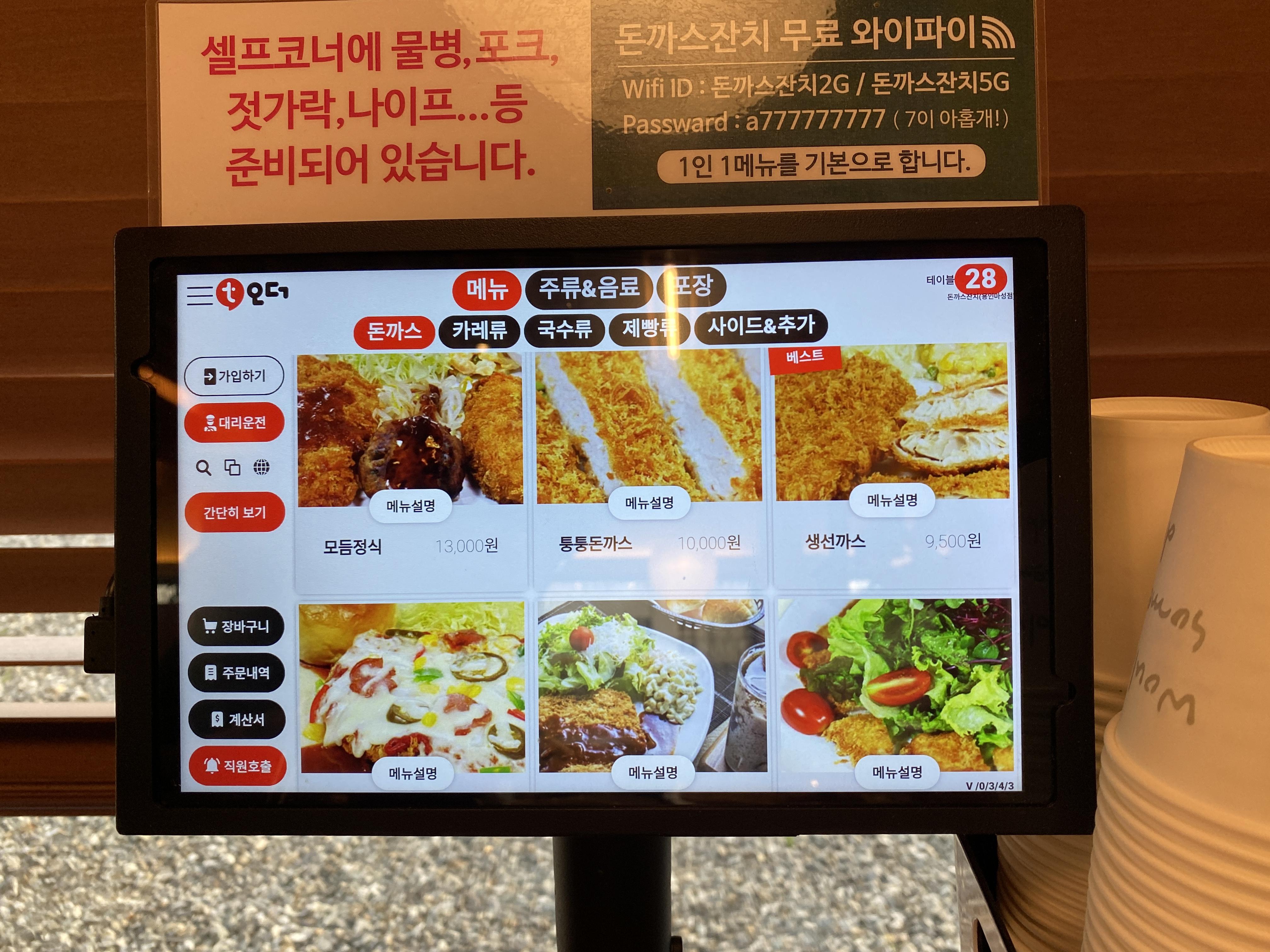 주문은 회전초밥집처럼 터치패널로 하면 됩니다. 대표메뉴는 잔치국수+돈까스, 비빔국수+돈까스 입니다.