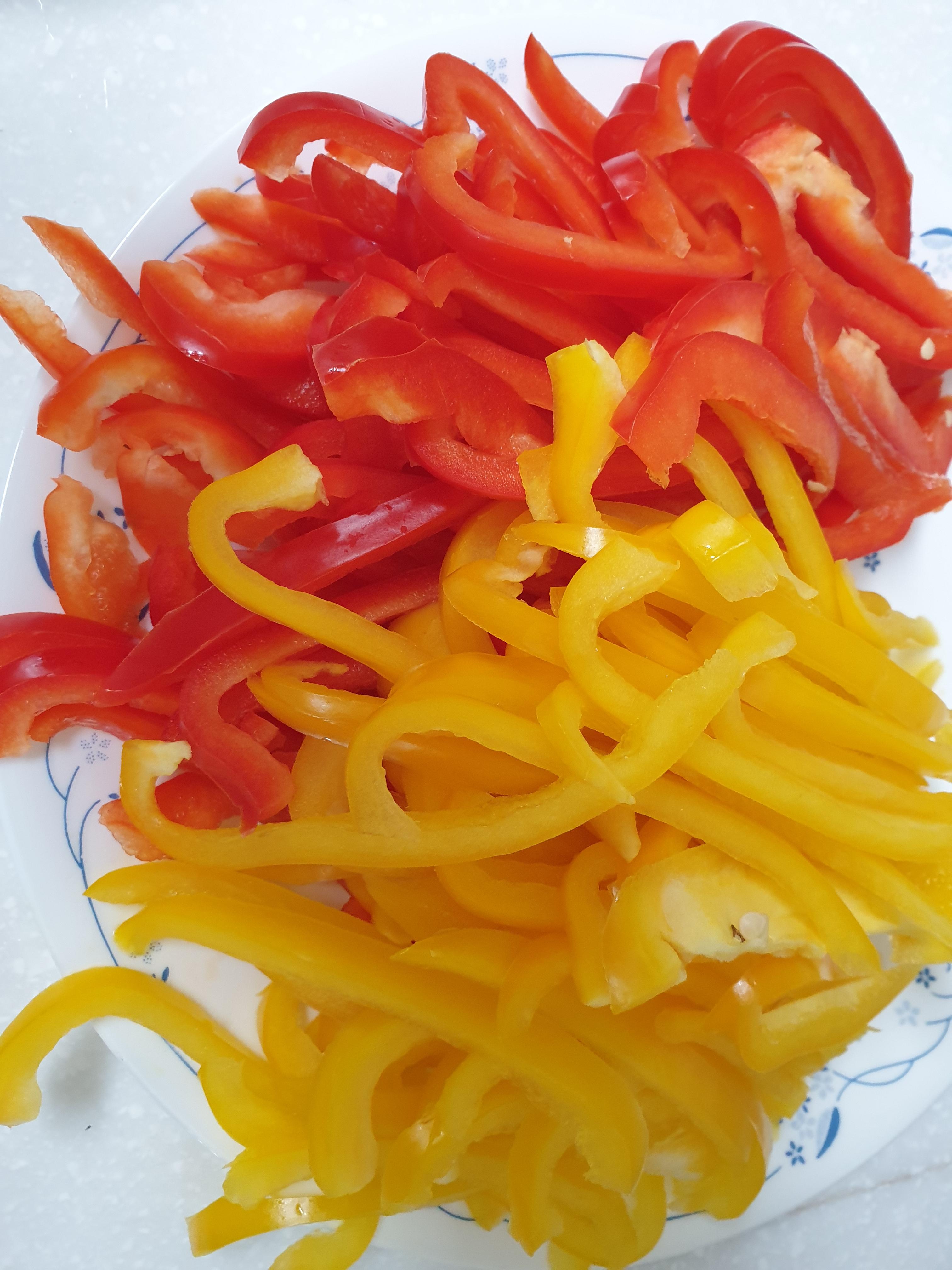 또띠아에 싸 먹기 좋게 길쭉 길쭉하게 양파와 파프리카를 채썰어서 준비해준다.