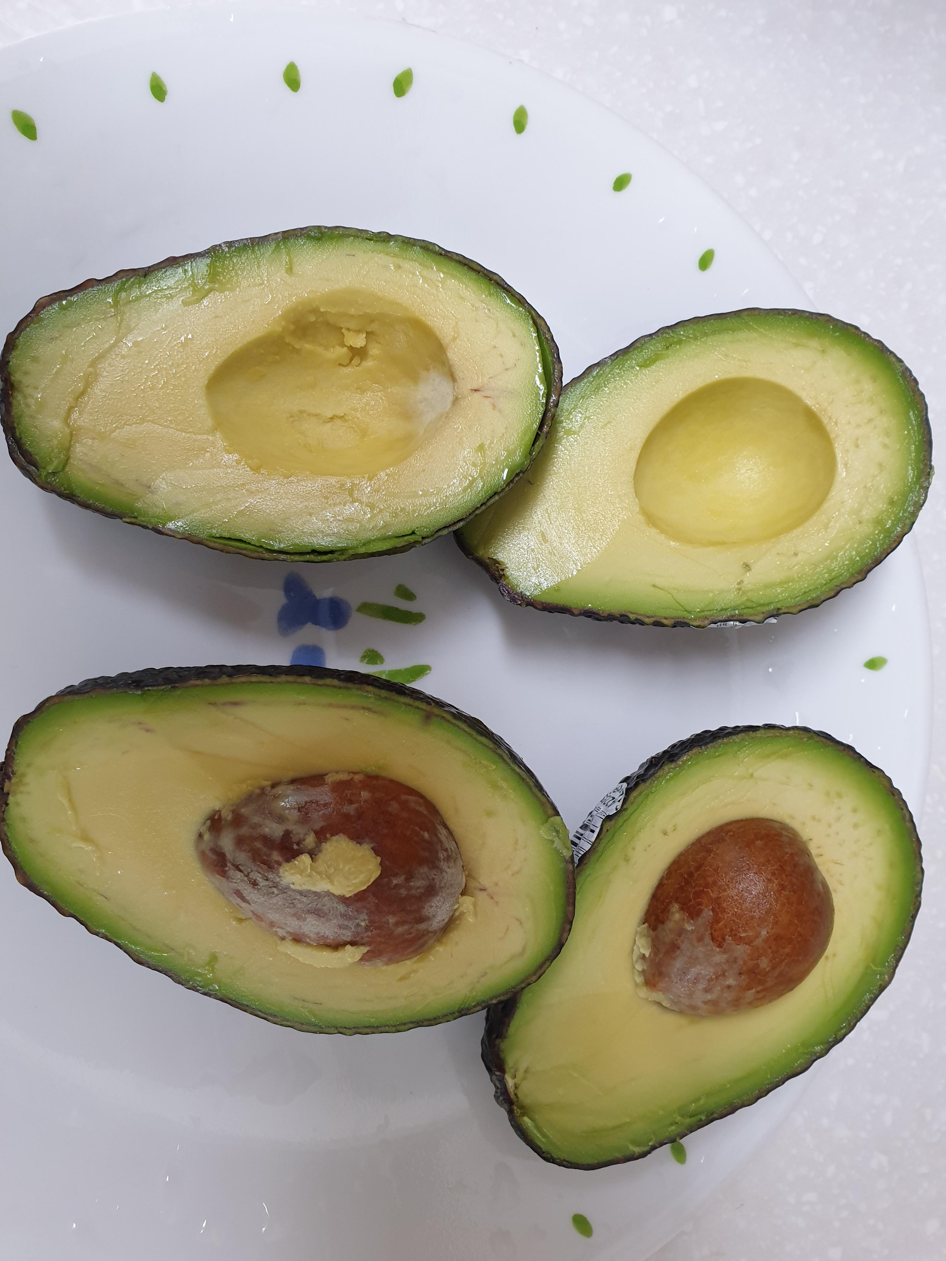 * 아보카도 손질할때는 망고를 자를때 처럼 중간을 기점으로 길쭉하게 칼로 반을 가른후에 살짝 비틀어 주면 반으로 분리 되는데, 숱가락을 이용해서 씨도 살살 제거해 주면 모양이 망가지지 않고 씨를 제거할수 있다. 아보카도를 왜 식물 버터라고 하는지 씨를 제거해보면 알수 있다.
