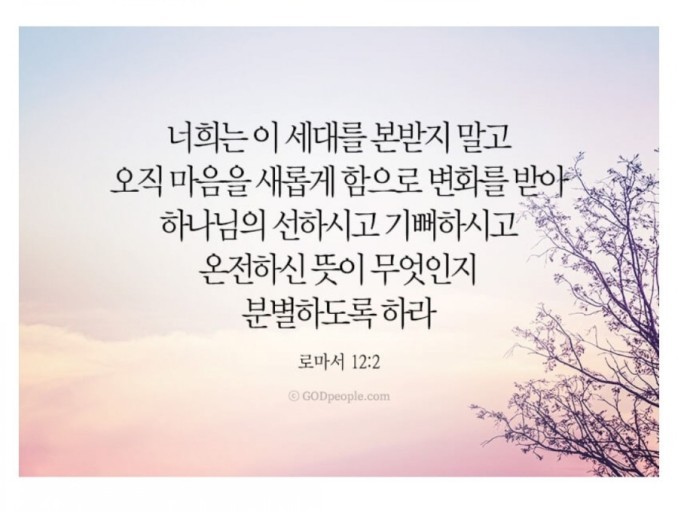 2 너희는 이 세대를 본받지 말고 오직 마음을 새롭게 함으로 변화를 받아 하나님의 선하시고 기뻐하시고 온전하신 뜻이 무엇인지 분별하도록 하라