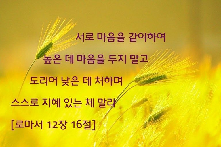 16 서로 마음을 같이하며 높은 데 마음을 두지 말고 도리어 낮은 데 처하며 스스로 지혜 있는 체 하지 말라