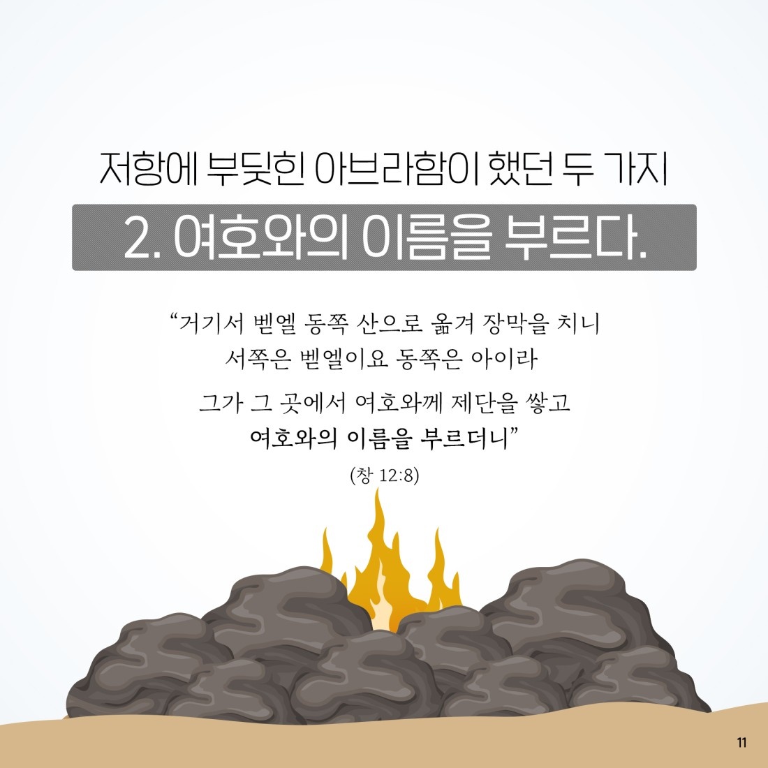 2. 여호와의 이름을 불렀다. 아브라함이 왜 여호와의 이름을 불렀나? 하나님을 향한 믿음과 신뢰를 공적으로 선포하는 행동이다. 가나안의 진짜 주인은 여호와 하나님이라는 것을 선포하는 것이다. 우리는 가나안에서 내가 누릴 혜택만 살핀다. 하나님은 아브라함의 이름을 높여드리겠다고 하고 (창12:7_여호와께서 아브람에게 나타나 이르시되 내가 이 땅을 네 자손에게 주리라 하신지라 자기에게 나타나신 여호와께 그가 그 곳에서 제단을 쌓고)아브라함은 하나님의 이름을 높여 드리려고 한다. 참 멋지지 않은가? 우리 하나님은 꿈꾸게 하신다. 열악한 상황에서 꿈꾸게 하신다. 성도님들에게 용납되지 않는 것. 무례한 것, 목회철학과 꿈이 없는 목사. 기다리지 않는다. 하나님도 마찬가지이다. 그래서 하나님의 꿈과 비전으로 무장해야 한다. 하나님은 꿈 꾸시는 것을 좋아하신다.
