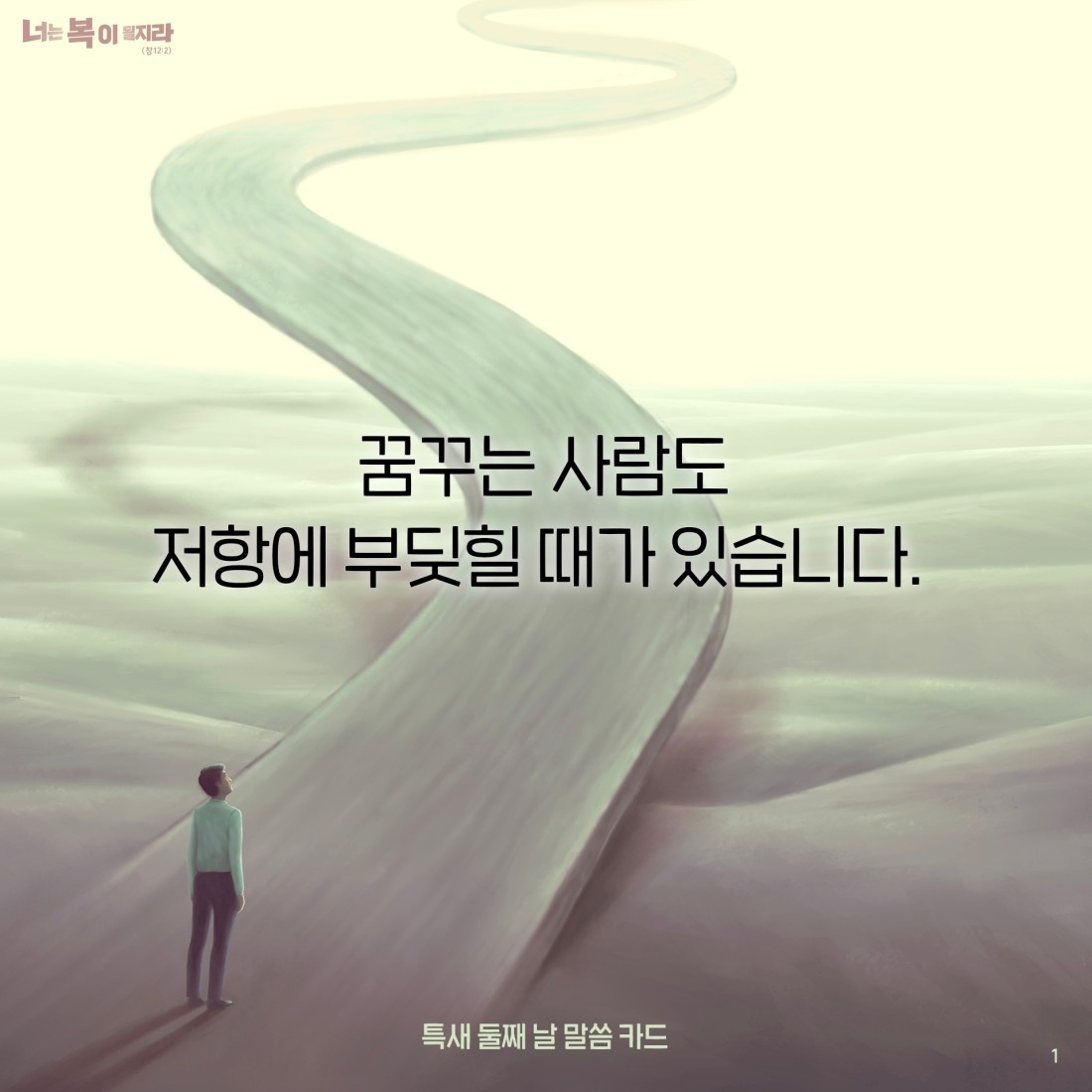 하나님 주신 꿈으로 달려가면 늘 가슴 뛰는 것이 아니다. 꿈을 꾸는 그 순간부터 괴롭다. 할 일이 너무 많아진다. 꿈꾸는 것 고달픈 것이다. 그러나, 순종은 저항에 부딪친다는 말이 있다(엘론로스). 저항이 저항으로 끝나는 것이 아니라 하나님을 신뢰할 때 유익한 것이 많다.