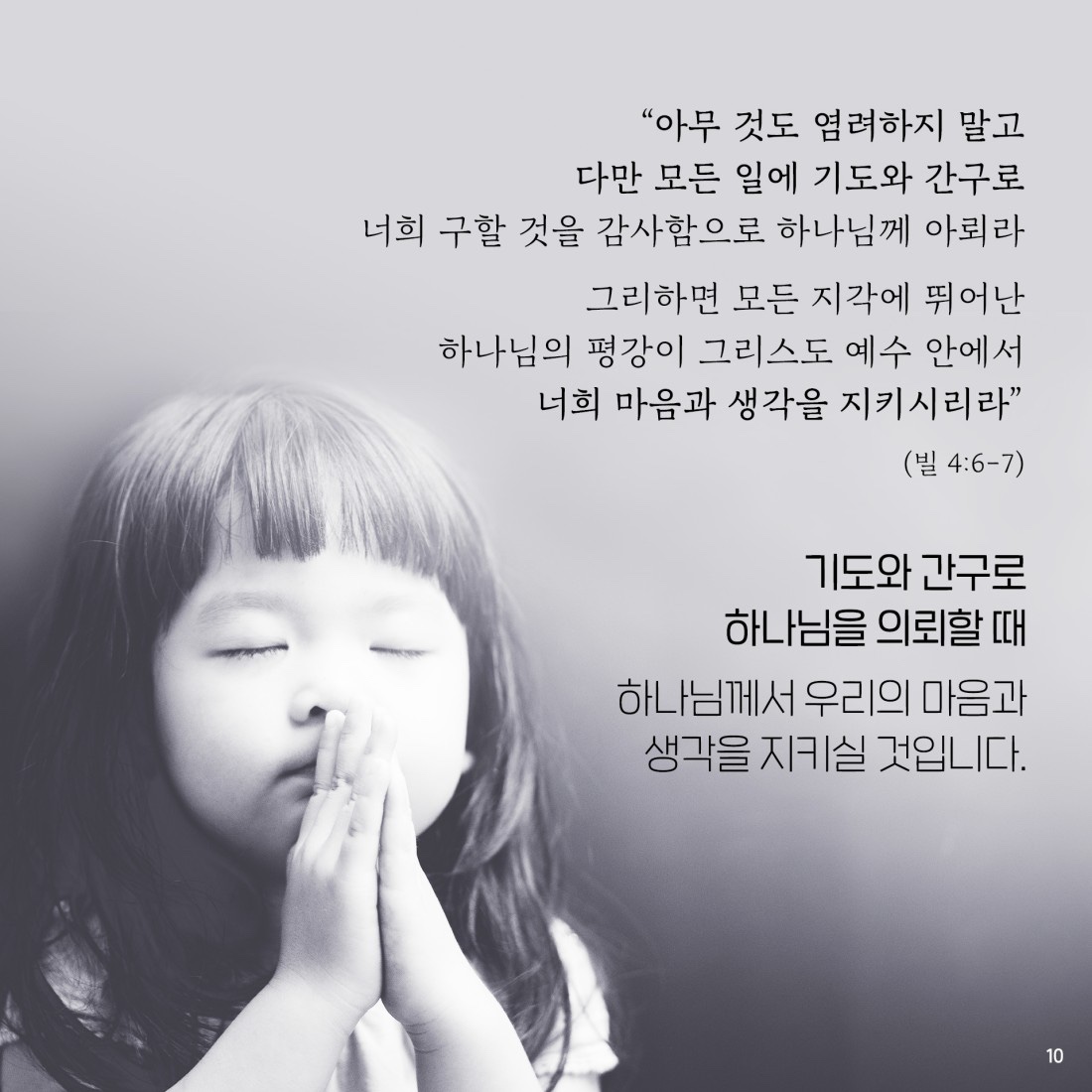 (빌4:6-7) 아무 것도 염려하지 말고 다만 모든 일에 기도와 간구로, 너희 구할 것을 감사함으로 하나님께 아뢰라 그리하면 모든 지각에 뛰어난 하나님의 평강이 그리스도 예수 안에서 너희 마음과 생각을 지키시리라.