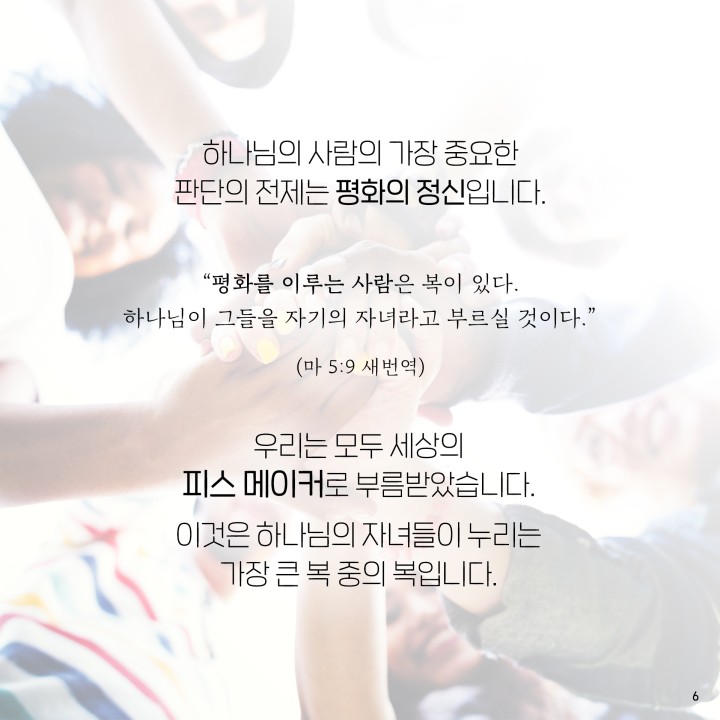 1.평화의 정신이 있다. 전제가 있다. [창13:8] 아브람이 롯에게 이르되 우리는 한 친족이라 나나 너나 내 목자나 네 목자나 서로 다투게 하지 말자. 아브라함은 다투지 않았다. [마5:9, 새번역] 평화를 이루는 사람은 복이 있다. 하나님이 그들을 자기의 자녀라고 부르실 것이다. 하나님의 자녀의 특징은 평화를 이루는 것이다. 은혜 받기 전에 트러블 메이커였는데, 은혜 받고 피스 메이커가 되었다. 우리 삶에 가장 중요한 것은 평화의 정신이다. [히12:14] 모든 사람과 더불어 화평함과 거룩함을 따르라 이것이 없이는 아무도 주를 보지 못하리라. 화평함을 이루어야 한다. 거룩을 이루기 위해서 평화를 빼앗기면 안된다. 피스메이커로의 거룩이 이루어질 수 있다.