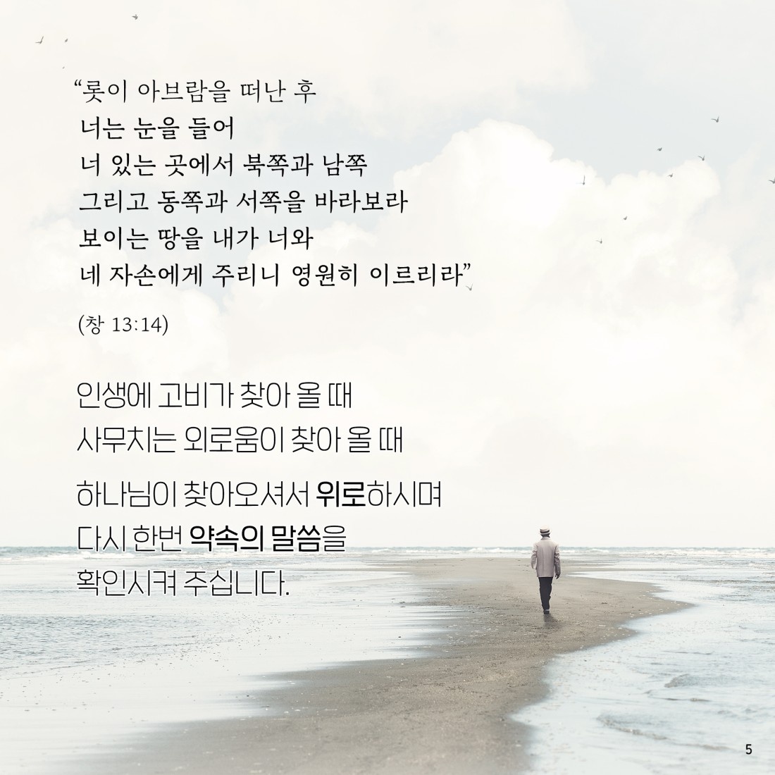 [창13:14-15] 롯이 아브람을 떠난 후에 여호와께서 아브람에게 이르시되 너는 눈을 들어 너 있는 곳에서 북쪽과 남쪽 그리고 동쪽과 서쪽을 바라보라 보이는 땅을 내가 너와 네 자손에게 주리니 영원히 이르리라.