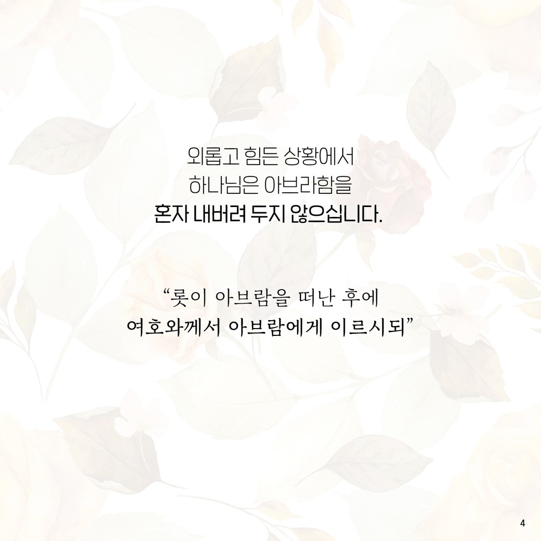 하나님의 약속이 임한 때에… 아브람은 장막을 옮겨 제단을 쌓았다. 롯 같으면 땅을 다녔을 것이다. 롯의 관심은 땅이 관심이었지만, 아브람에게는 하나님이 관심이었다. 제단을 쌓은 곳이 헤브론이다. 헤브론은 친구라는 어원이다. 하나님은 아브람을 친구로 부르신다. 헤브론은 아브람과 가족들에게 특별한 곳이다. 막벨라를 사서 가족묘로 사용했다. 하나님이 자기를 친구로 부르신 곳이다. 백문일답! 내 주변에 아무도 없나? 하나님께서 지금 나에게 찾아오셔서 말씀하실 때이다. 나에게 답을 주실 때이다. 약속의 말씀을 따라 여기까지 왔다. 예수님만이 내 힘이고 참 소망이다. 예수님이 내 삶의 이유이다.