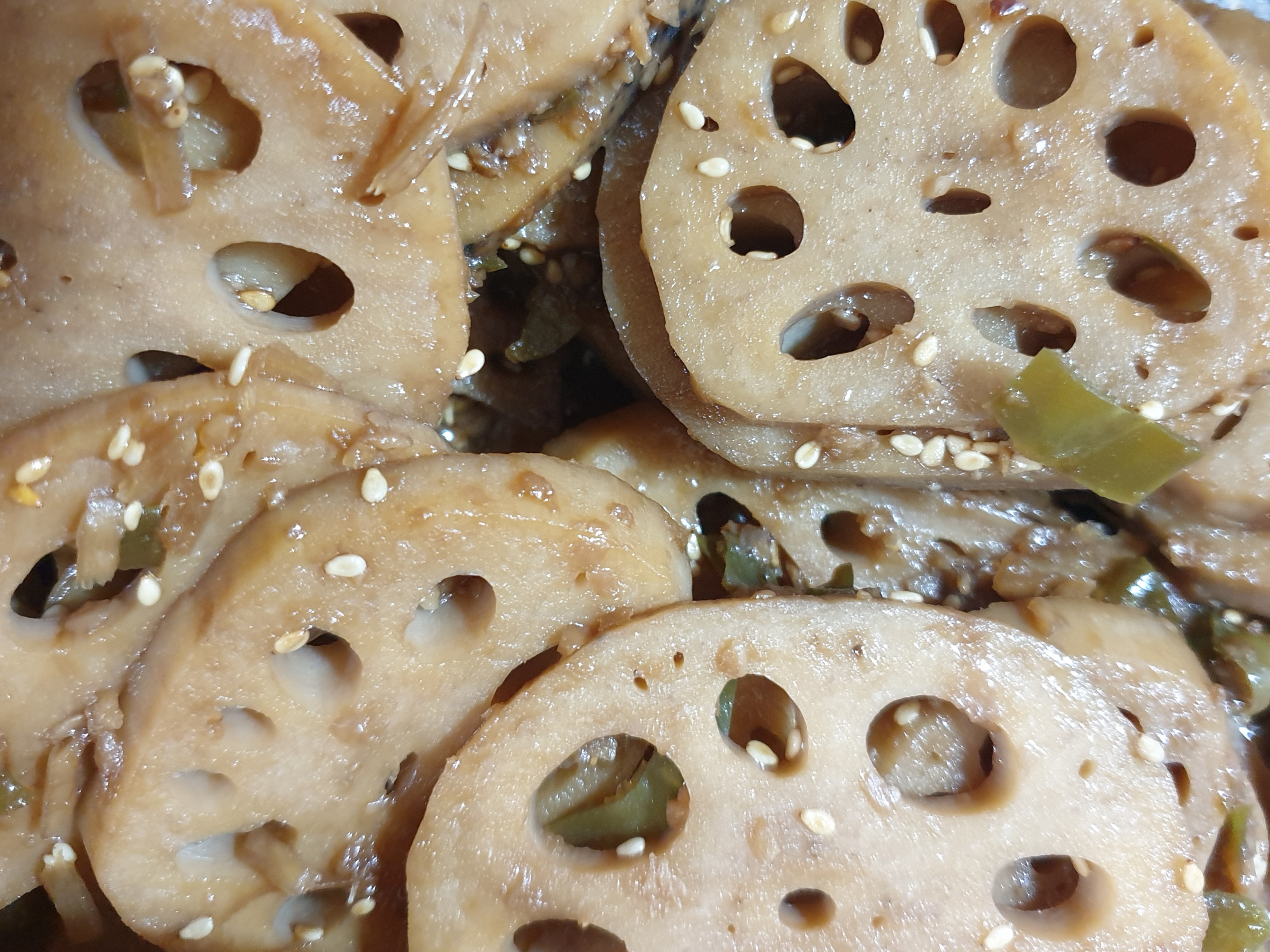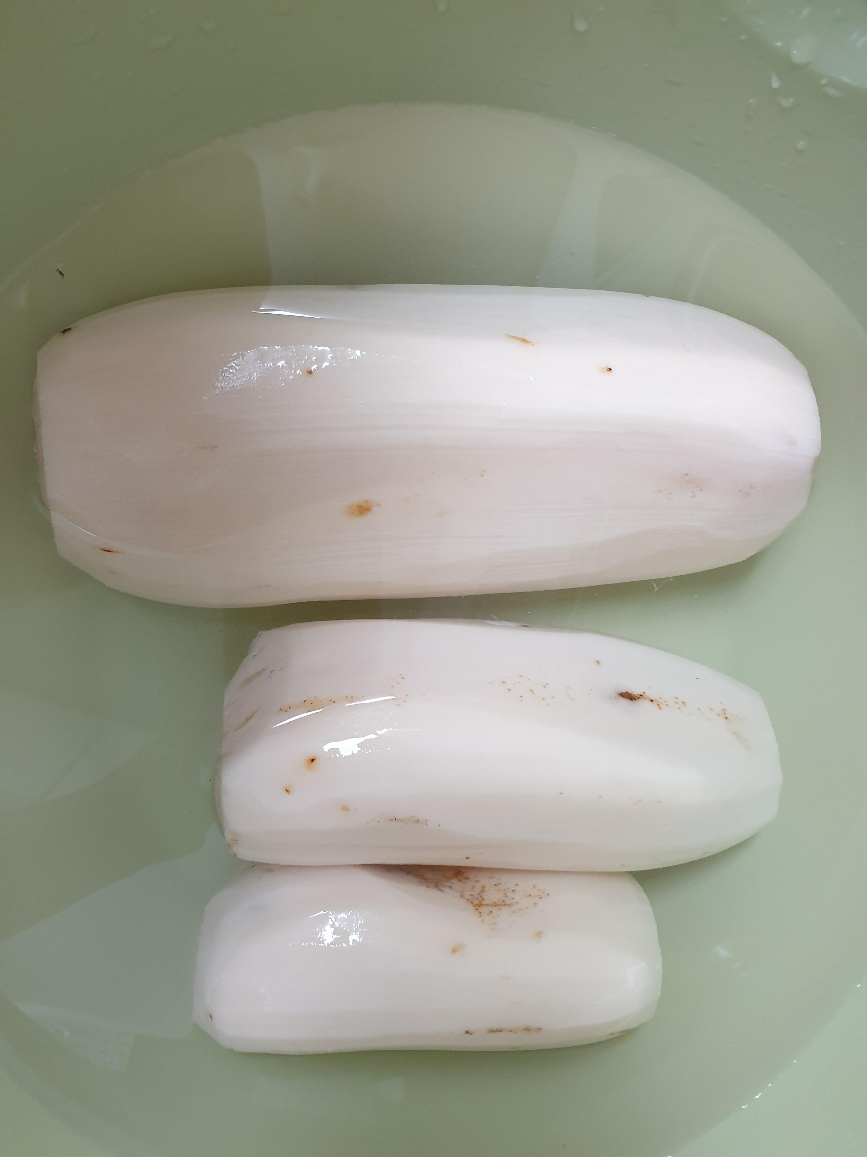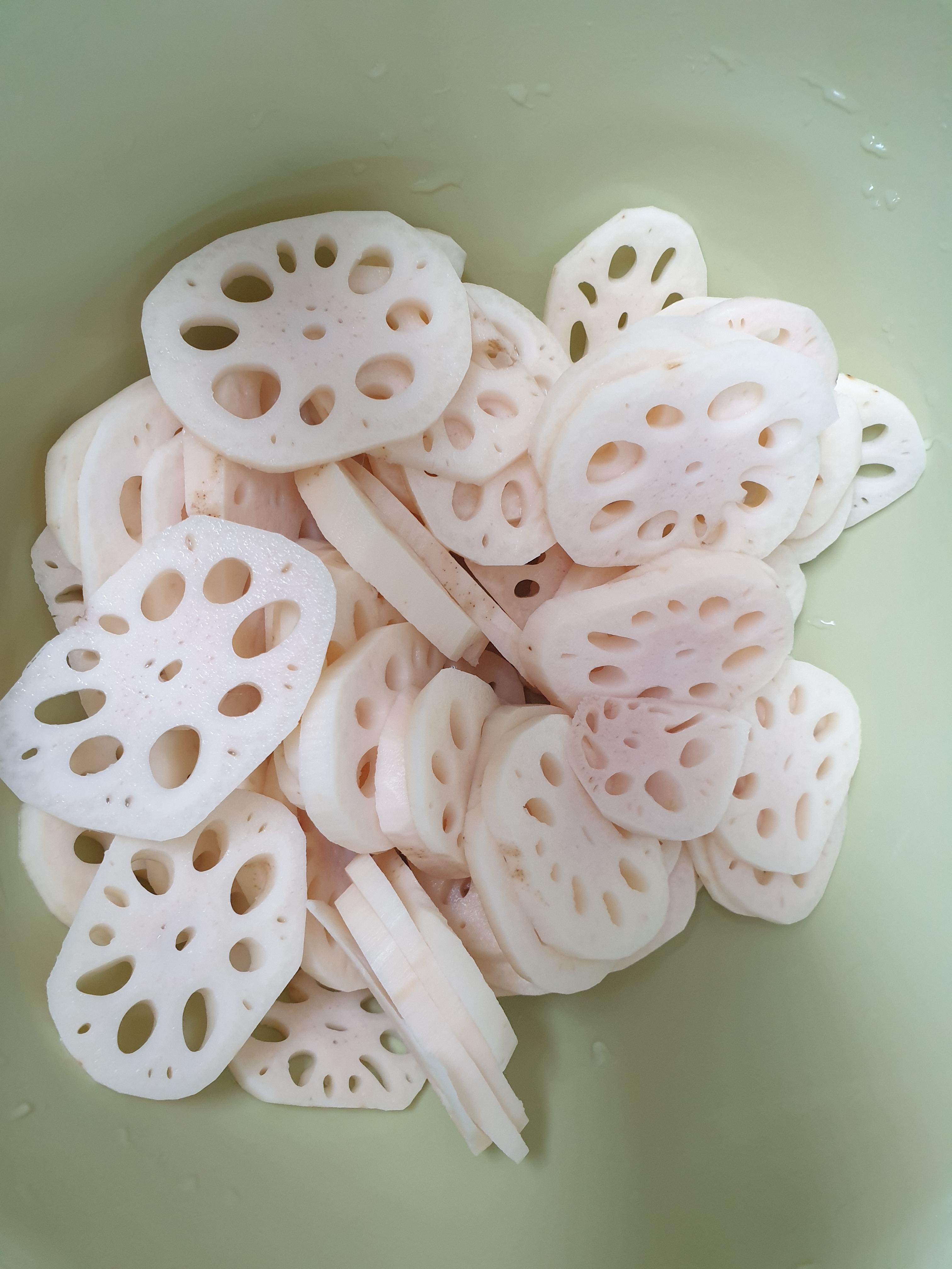 연근을 벗겨서 식초 탄 물에 넣어뒀다가 맹물로 챙궈줌