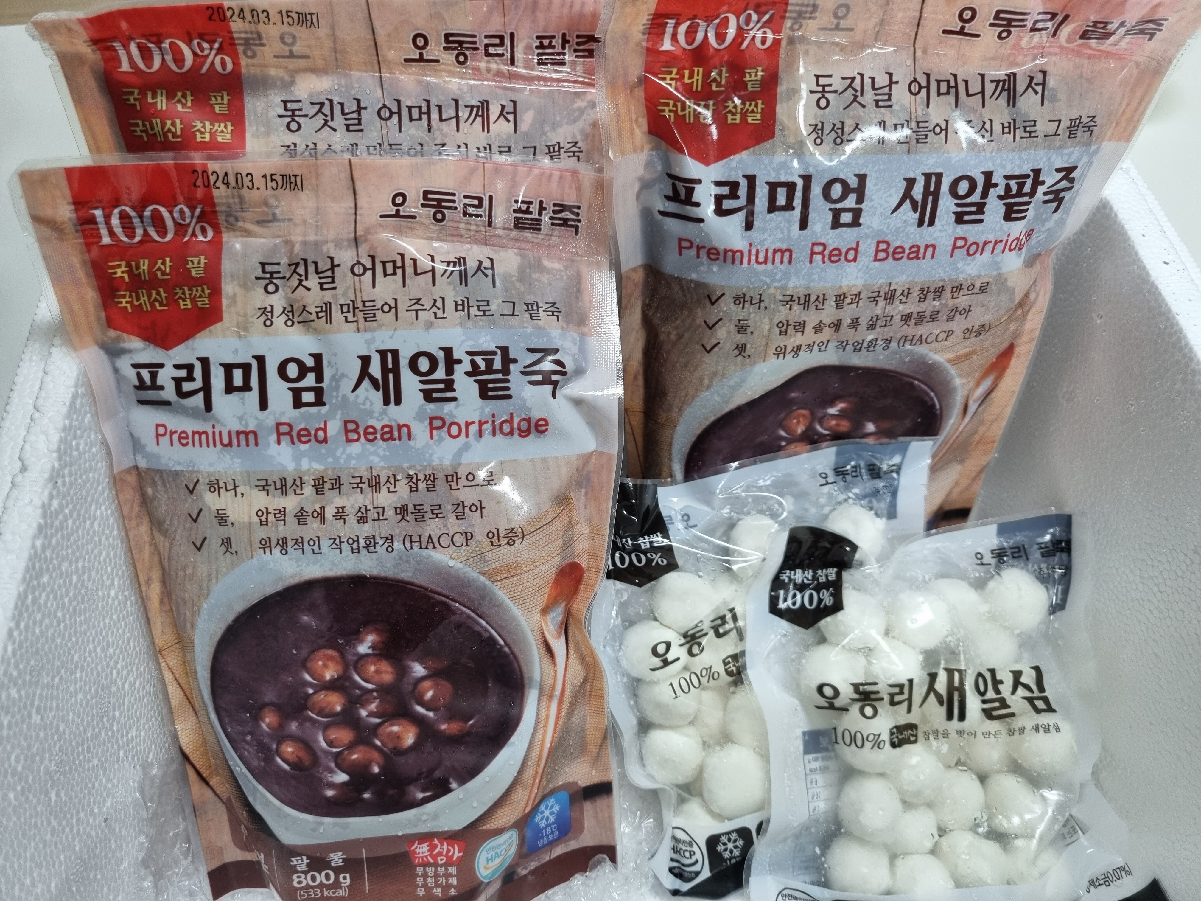 아이스 박스에 팥물 3봉지와 새알심 2봉지가 뽁뽁이에 잘 싸져서 아이스팩을 아래위로 이불로 덮고 도착했다.