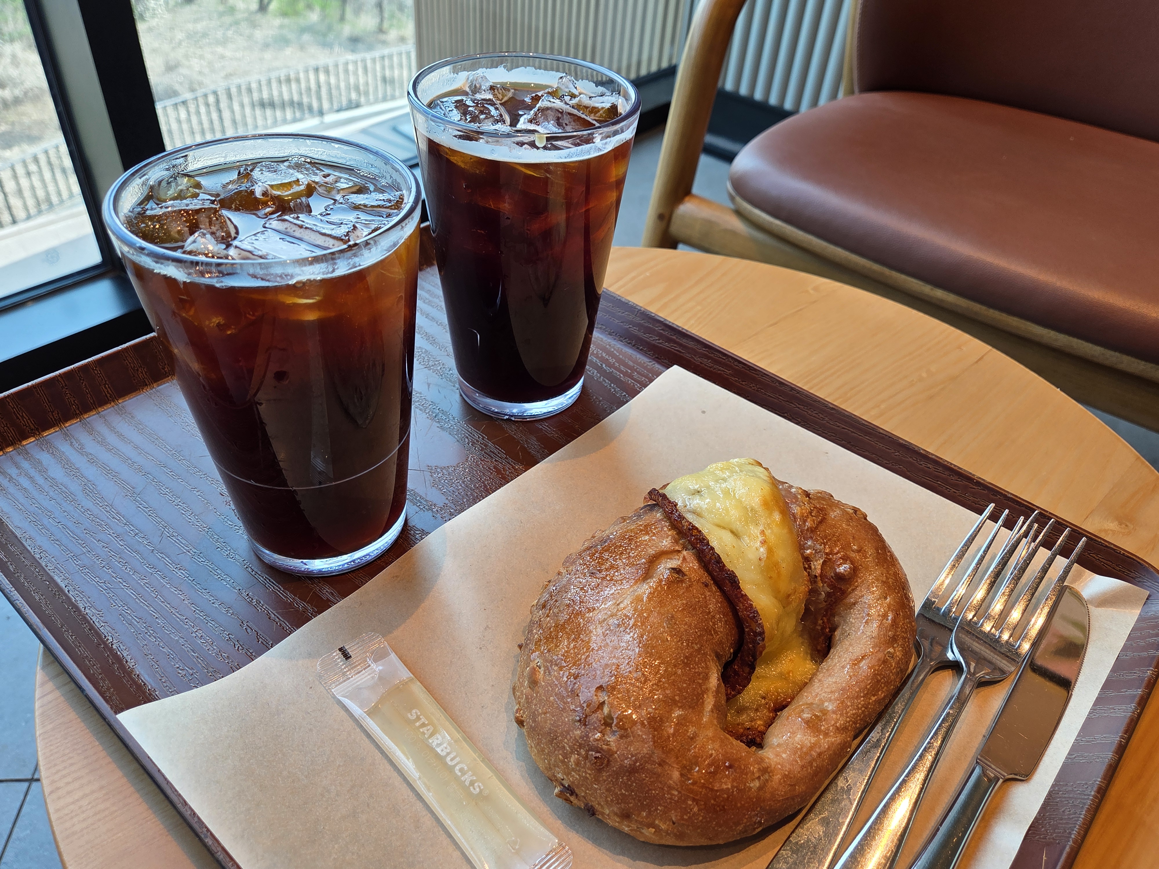 주문한 메뉴는 아메리카노와 허니 치즈 피넛 브레드.