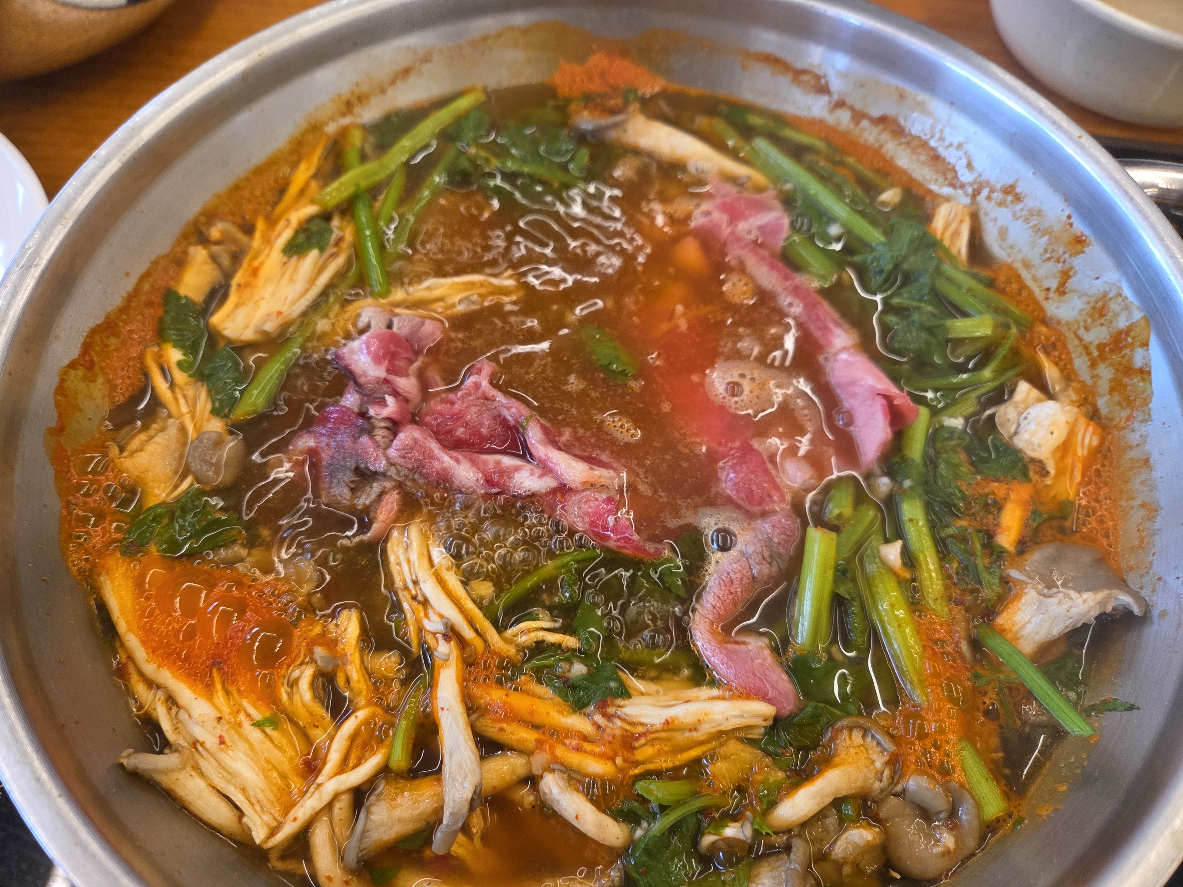 기본으로 미나리, 버섯, 소고기가 푸짐하게 나와요.