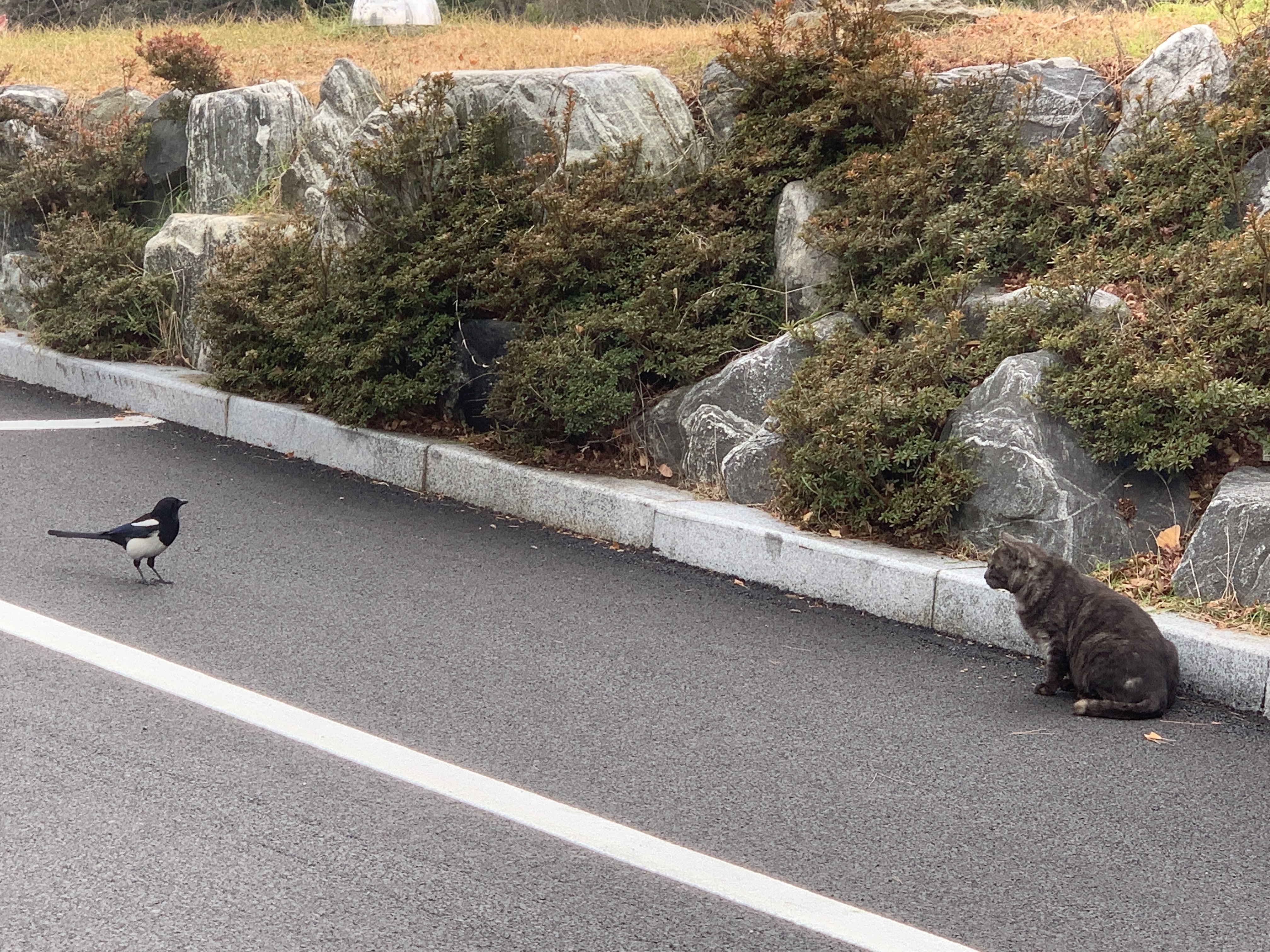 산책하는 길에서 만난 까치와 고양이 입니다.