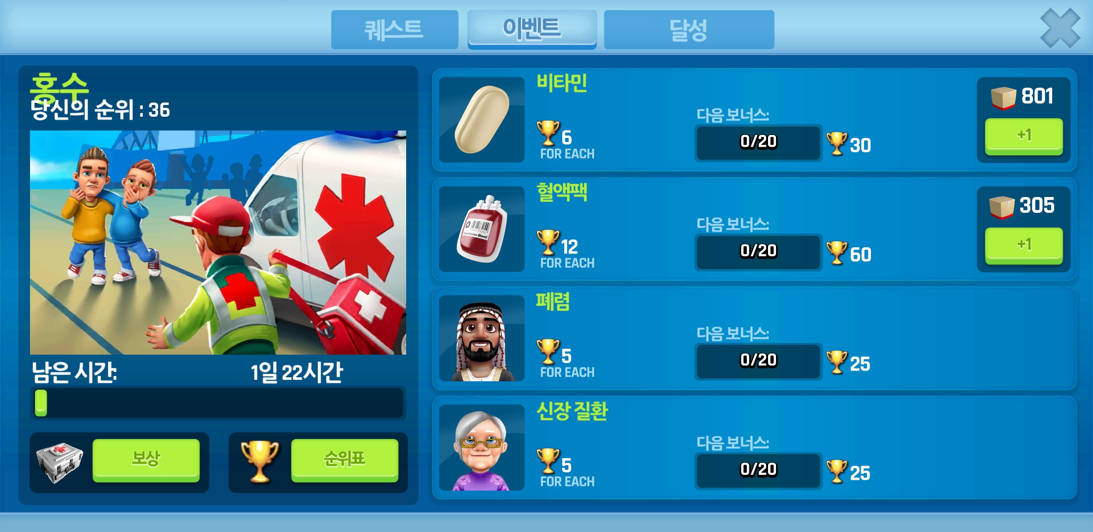 Dream Hospital 업그레이드 이후에 환자를 빠르게 데리고 올수 없기 때문에 결국 이번 이벤트는 물량공세가 답일것 같습니다.