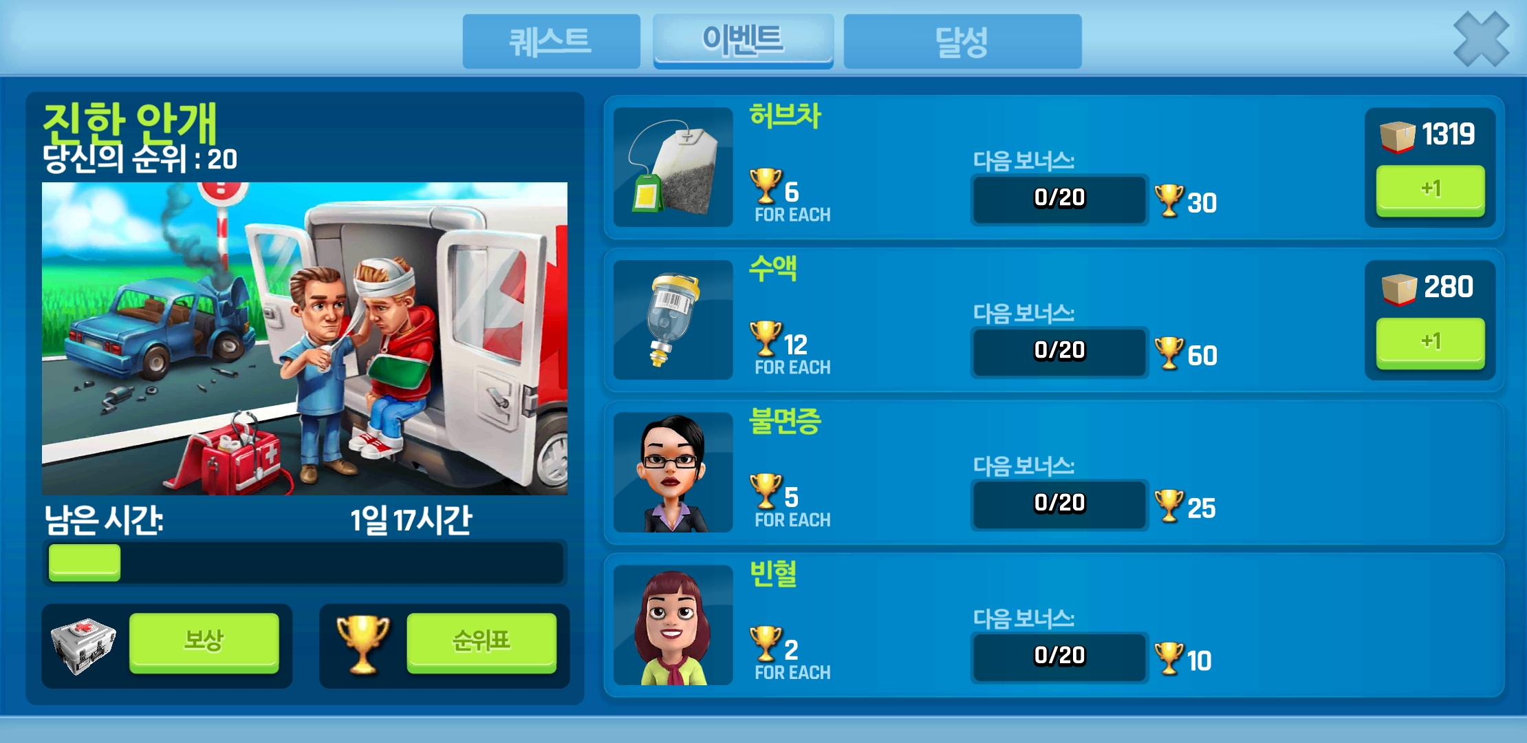 이번 이벤트에서 필요한 것은 허브차와 수액입니다. 치료해야 할 환자는 불면증 환자와 빈혈 환자입니다.