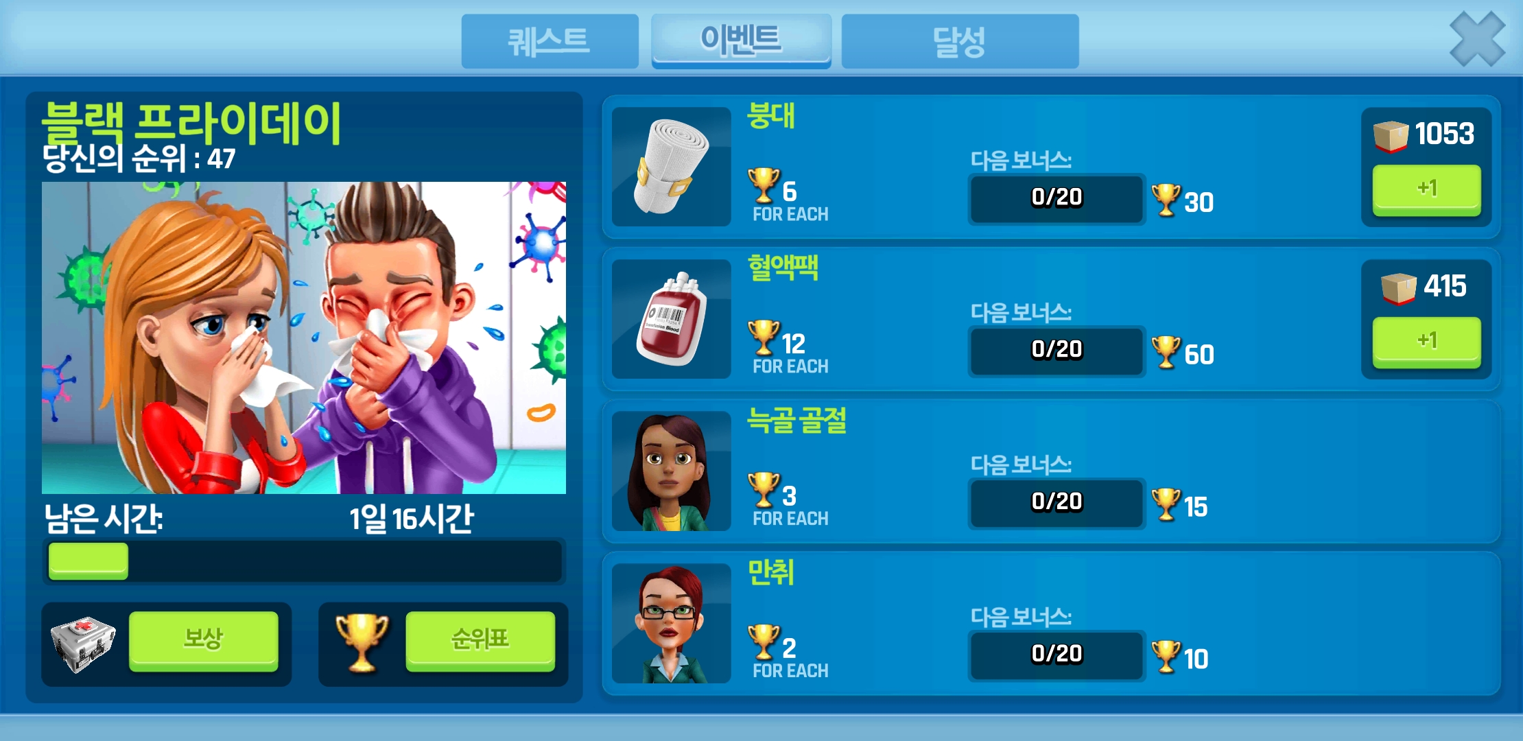 이벤트에 필요한 것은 붕대와 혈액팩 그리고 늑골골절 환자 와 만취환자를 치료해주는 것입니다.