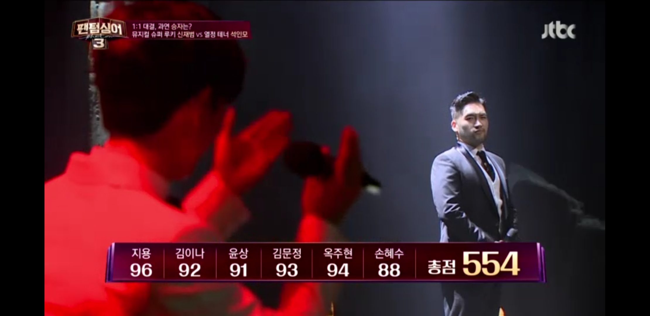 이둘의 무대를 지켜본 윤상은 “너무 멋진 무대 감사하다. 역전승이 느껴졌다. 조금 더 스마트한 플레이가 필요했던 누군가가 있었다”라며 “처음엔 누군가가 주도권을 갖고 갔는데 결국 노래가 끝날 때는 그걸 뺏어 온 느낌이다. 저는 1점 차다”고 말해 두 사람을 긴장하게 했다.