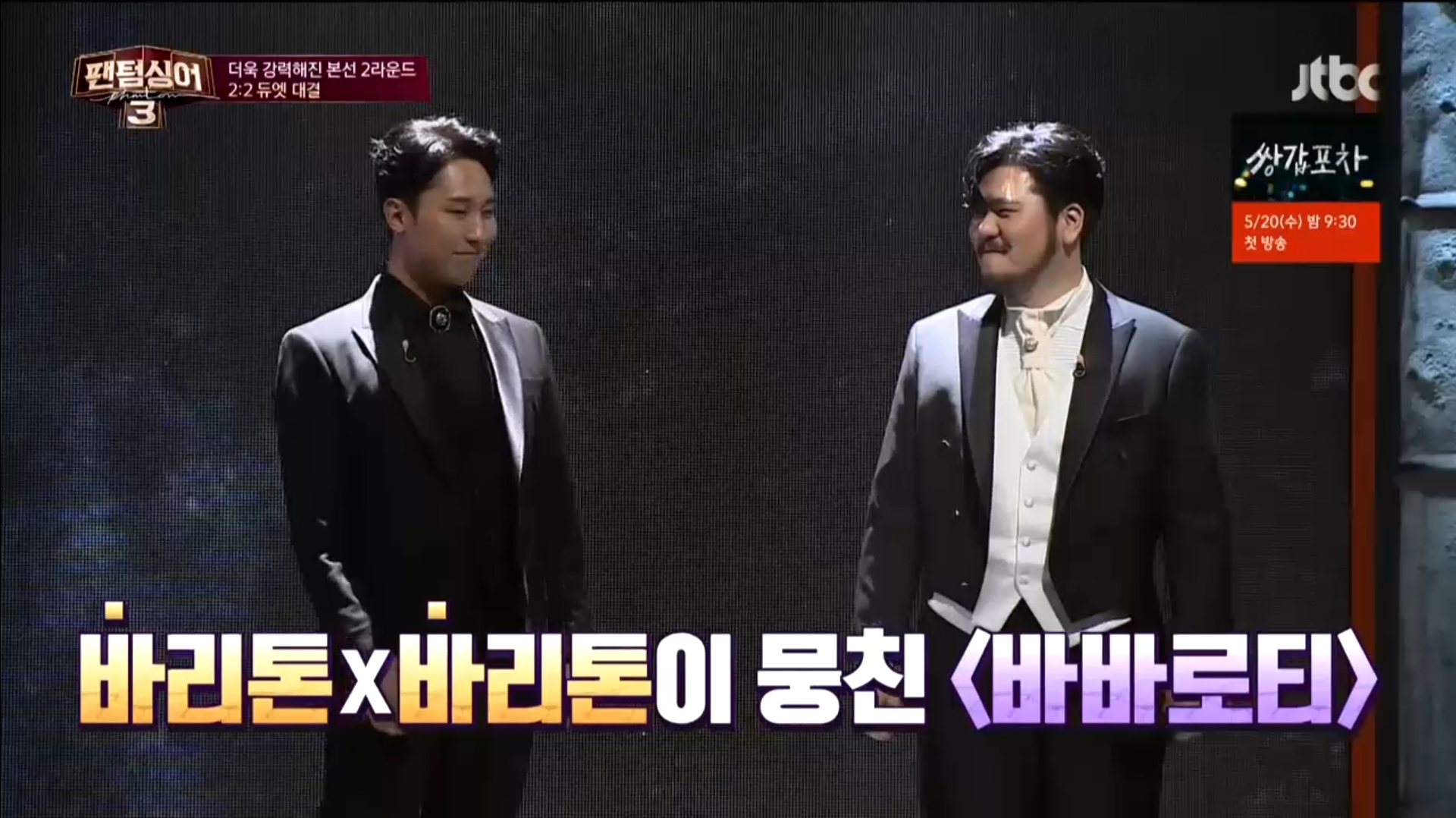 JTBC 팬텀싱어3 본선 2 라운드 2:2 듀엣대결에서 바리톤과 바리톤이 뭉친 ''바바로티 - 안동영ㆍ 정민성'' 과 눈물샘을 자극하는 부드러운 보이스 ''작은코가 맵규 - 소코ㆍ 남규빈''이 대결을 펼쳤다.