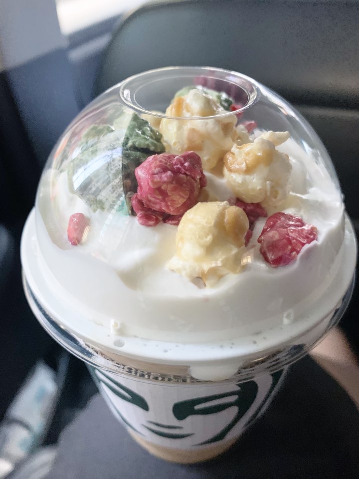 토피넛 팝콘 트리 프라푸치노는 토피넛 프라푸치노 위에 팝콘이 올라간 음료에요.