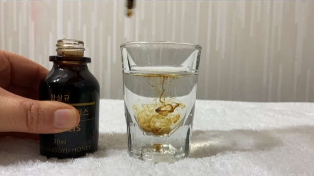 물에 떨어 트렸을때 뭉치지 않고 잘 퍼지는 프로폴리스가 좋은 프로폴리스 라고 하던데 잘 퍼지네요 ㅎ