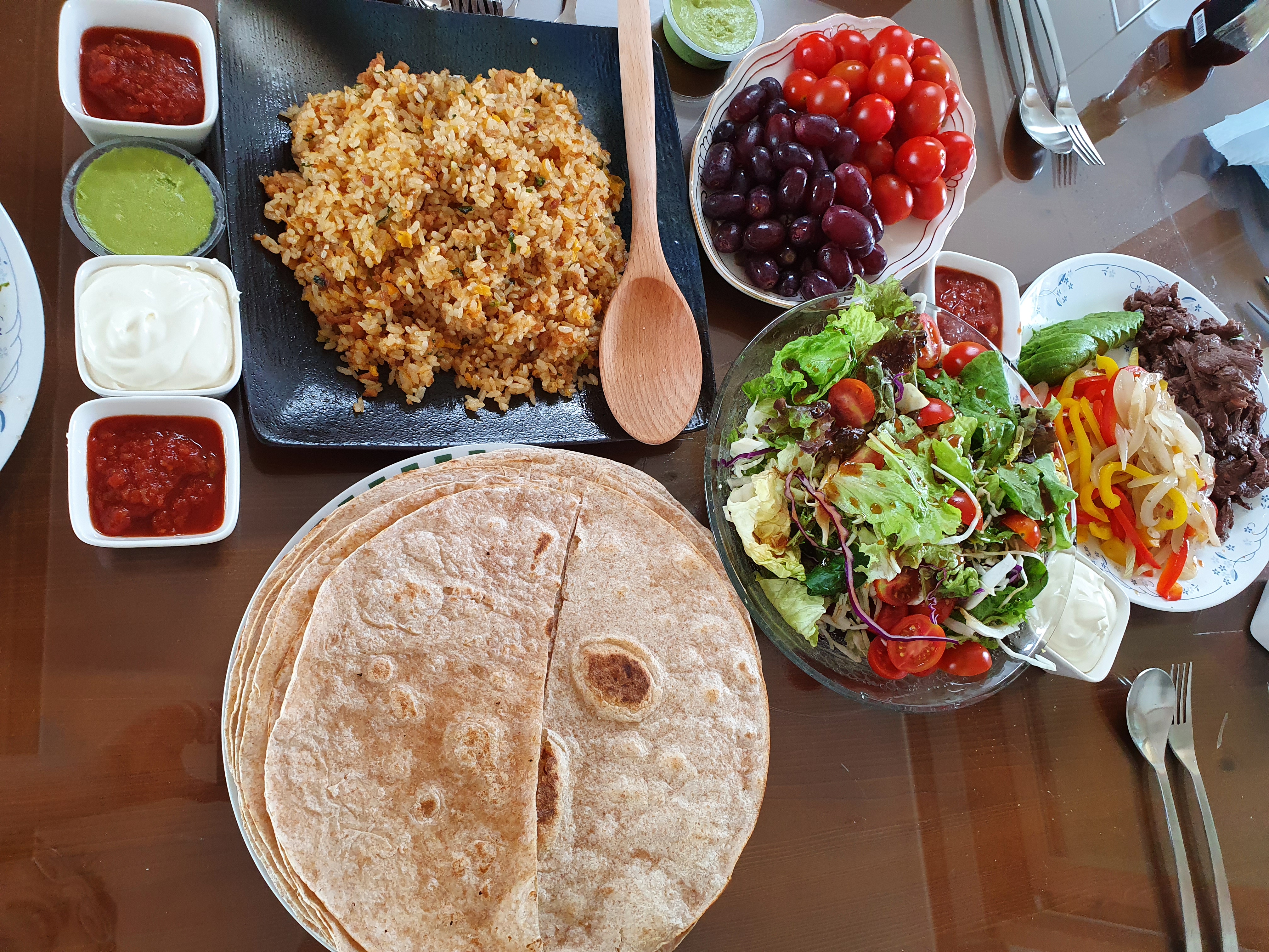 달걀과 굴소스 집에 있는 야채와 고기등을 송송 썰어 달걀 고기 야채 볶음 밥을 만들어 옆에 살짝이 놔주면 더 푸짐해 보이고 화이타와 곁들여 먹기에 든든하니 좋다.