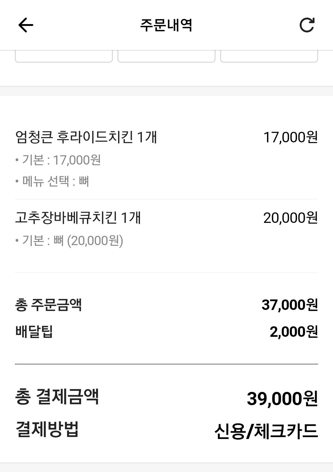 오늘은 고추장바베큐치킨과 엄청큰 후라이드 치킨을 주문했습니다.