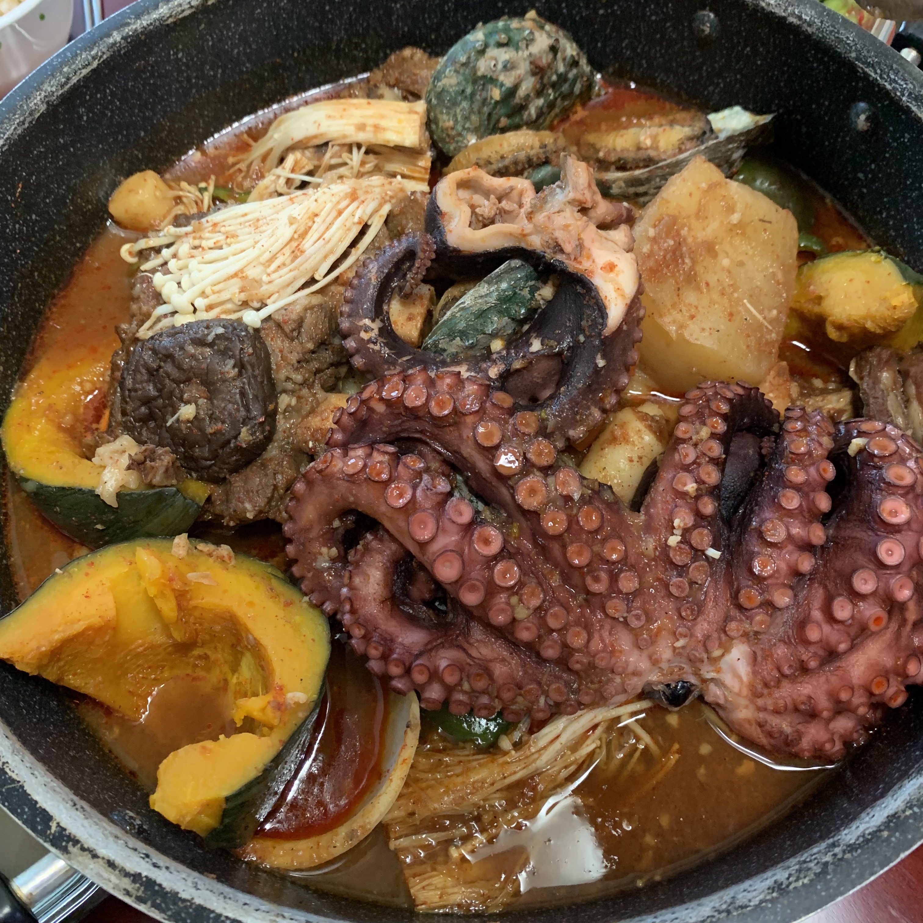 문어 삼합 갈비찜과 매운 갈비찜을 포장해와서 부모님집에서 제일 큰 냄비에 섞어 다시한번 데웠다.