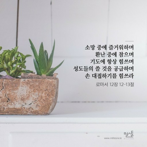 12 소망 중에 즐거워하며 환난 중에 참으며 기도에 항상 힘쓰며