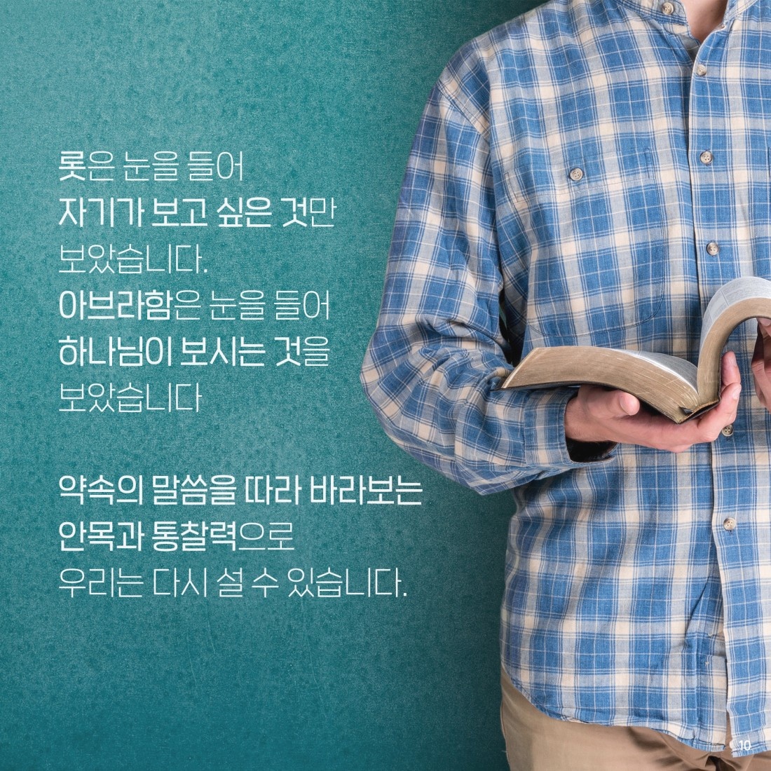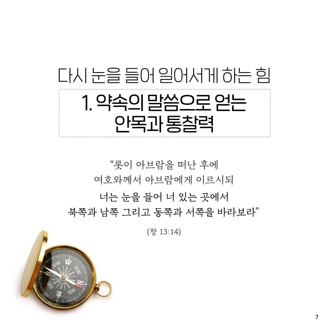 눈을 들어! 이것이 롯과 아브라함의 결정적인 차이이다. 롯과 아브라함의 공통점이 있다. 둘다 바라봤다. 롯은 자기 스스로 보고 싶은 것을 보기 위해 눈을 들었고, 그래서 망했다. 눈을 안 들었으면 더 좋았을 것이다. 아브람은 하나님께서 보게 하시는 것을 보았다. 롯은 요단 평야만 바라보았고, 아브람은 동서남북을 바라보았다. 우리는 아브라함을 선택하며 기도하는 은혜가 있어야 한다. 아브람과 롯의 가장 큰 차이는 약속이 있고, 약속이 없고이다. 약속의 말씀이 임한 후에 말씀을 따라 동서남북을 볼 수 있기를 기도한다. 아브람은 롯과 헤어진 후에 계속 하나님의 인도를 받는다. 그러나, 롯은 그 어디에도 인도를 받은 증거가 없다.