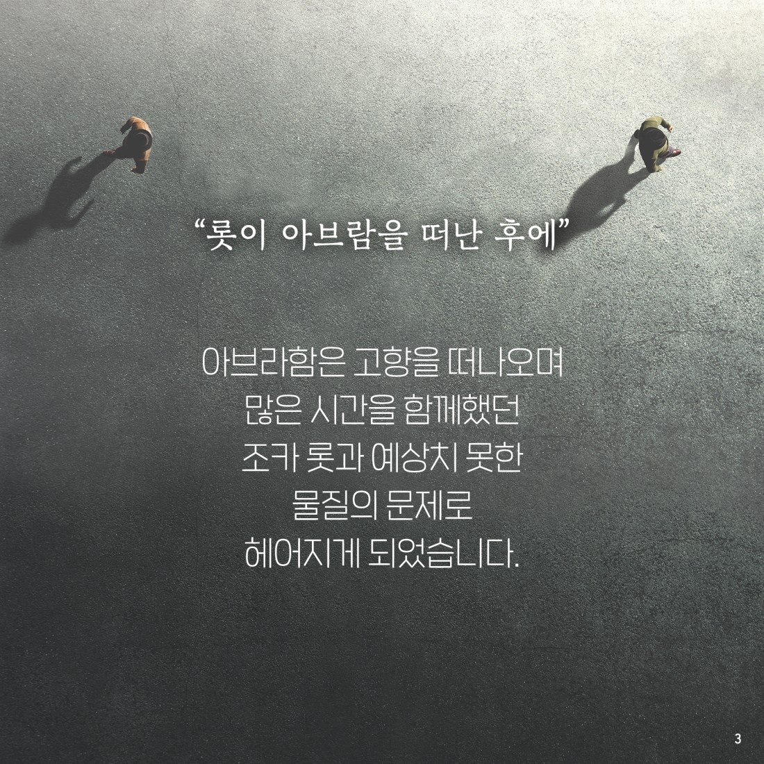 성경은 스토리이다. 성경을 읽을 때는 영적인 감정이입이 중요하다. 롯이 떠난 후에... 많은 감정이 있었을 것이다. 아브람은 하란을 떠날 때 조카 롯과 함께했다. 고향을 떠나 온 조카와 물질 문제 때문에 헤어졌다. 야속했을 것이다. 여기서 진짜 중요한 것이 있다.