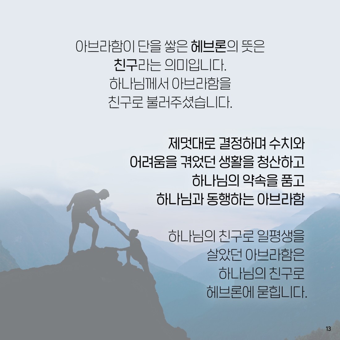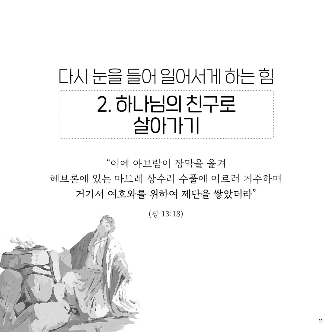 하나님의 약속이 임한 때에… 아브람은 장막을 옮겨 제단을 쌓았다. 롯 같으면 땅을 다녔을 것이다. 롯의 관심은 땅이 관심이었지만, 아브람에게는 하나님이 관심이었다. 제단을 쌓은 곳이 헤브론이다. 헤브론은 친구라는 어원이다. 하나님은 아브람을 친구로 부르신다. 헤브론은 아브람과 가족들에게 특별한 곳이다. 막벨라를 사서 가족묘로 사용했다. 하나님이 자기를 친구로 부르신 곳이다. 백문일답! 내 주변에 아무도 없나? 하나님께서 지금 나에게 찾아오셔서 말씀하실 때이다. 나에게 답을 주실 때이다. 약속의 말씀을 따라 여기까지 왔다. 예수님만이 내 힘이고 참 소망이다. 예수님이 내 삶의 이유이다.