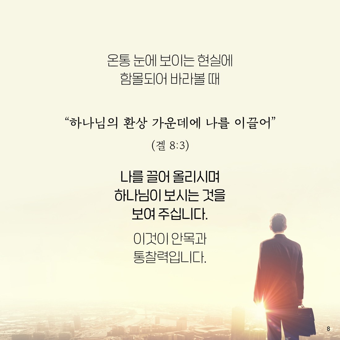 환상=하나님이 보시는 것. 눈에 보이는 것은 현실 밖에 없지만... 하나님께서 보시는 것을 보게 하신다. 안목=드러나지 않은 것을 보는 능력, 본질을 꿰뚫어 보는 힘. 통찰=예리한 관찰로 꿰뚫어 본다. insight이다. 내부를 보는 능력이다. 목사가 외적인 것을 보는 것도 필요하다. 하지만, 속을 보는 insight가 있어야 한다. 성도님들이 보지 못한 것을 보게 할 수 있어야 한다. 지도자는 드러나지 않는 것을 볼 수 있어야 한다. 이 안목과 통찰력은 하나님께서 주시는 것이다.