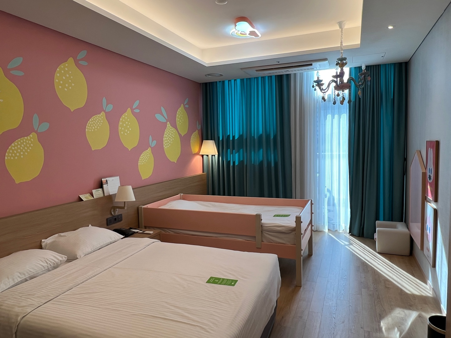 키즈룸은 더블침대와 어린이침대로 구성되어 있으며 블루레이서(남아용), 핑크레빗(여아용)으로 구성되어 있고 신나는 키캉스를 즐길 수 있는 키즈룸이라고 한다.