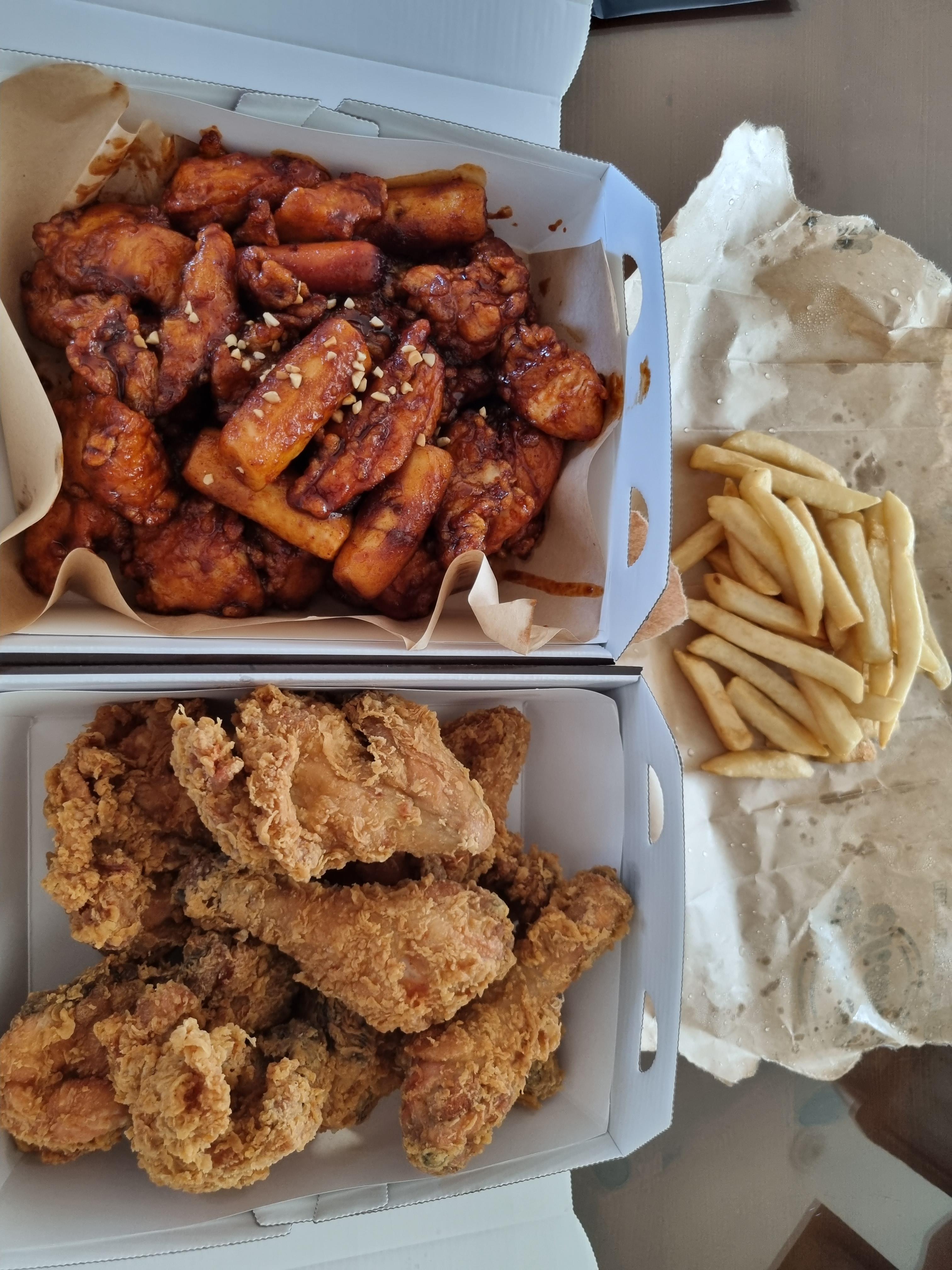 쿠팡잇츠로 주문하니 30분도 채 안걸려서 황금올리브치킨과 자메이카 소떡 만나치킨 BBQ감자튀김이 배달되었다.